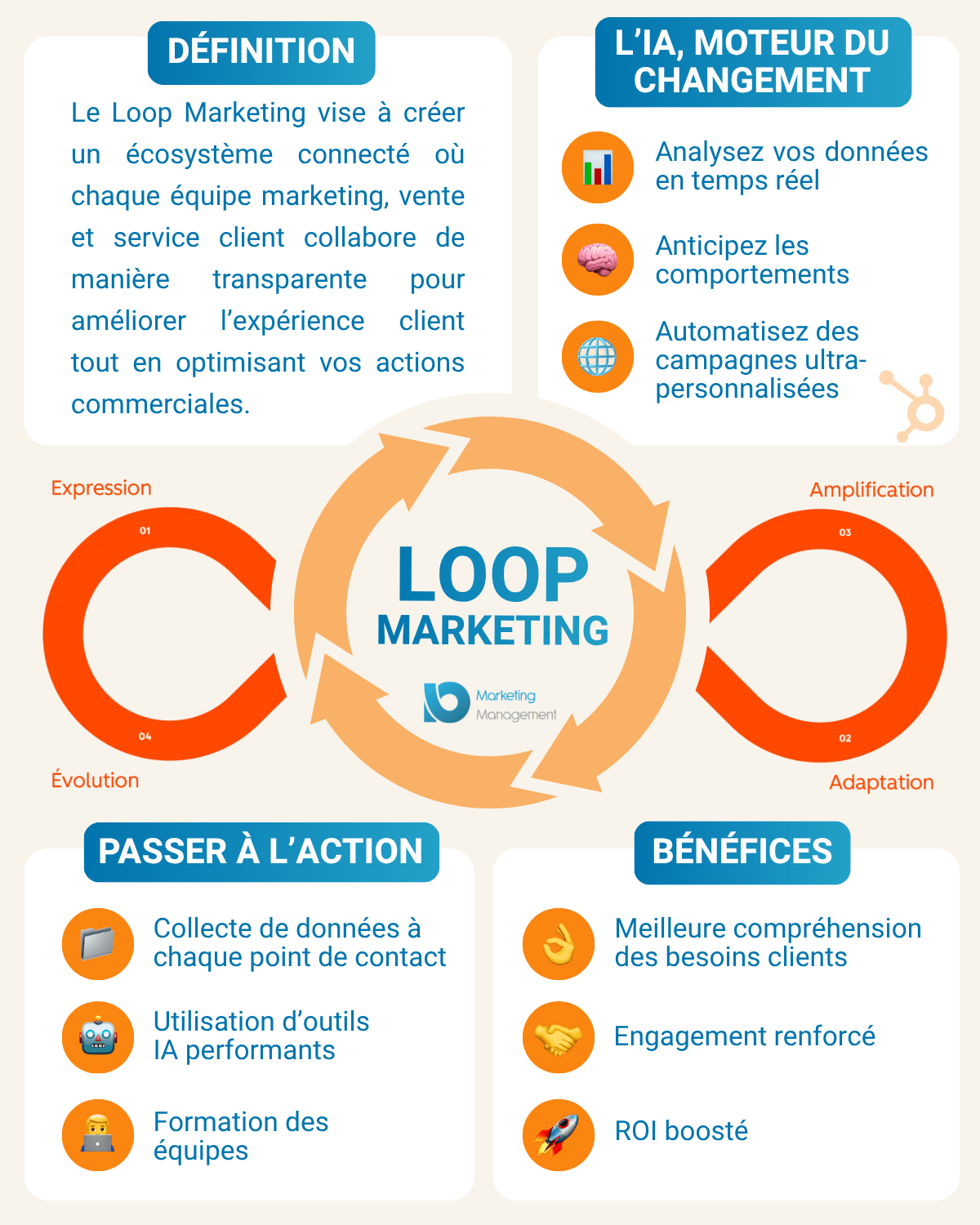 Avec le Loop Marketing, l’éditeur Hubspot* remet au goût du jour une méthode marketing qui transforme la manière dont vous interagissez avec vos clients à chaque étape de leur parcours. Le loop marketing ou comment “êtres humains” et 'IA s'alignent pour exprimer votre message, l'adapter à votre audience, l'amplifier sur tous les canaux et le faire évoluer en temps réel.